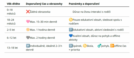 Pozor: Tabulka uvádí maximální doporučený čas u obrazovky – a to včetně všeho, co dítě dělá online: domácí úkoly, školní přípravu, emaily, chatování, hledání spojení i zábavu.